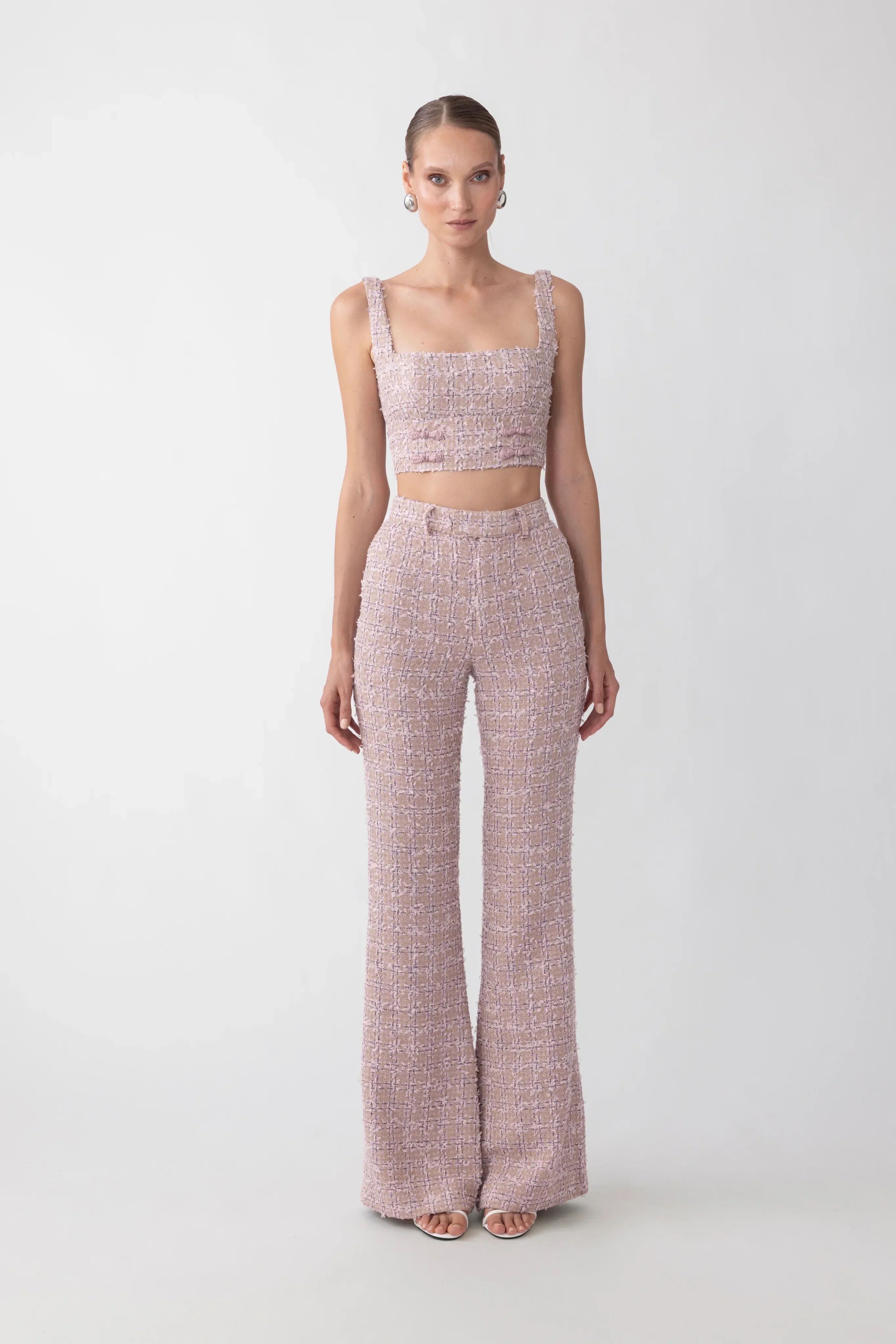 Tweed top with a square neckline featuring our signature hand-tied pipa knot detail