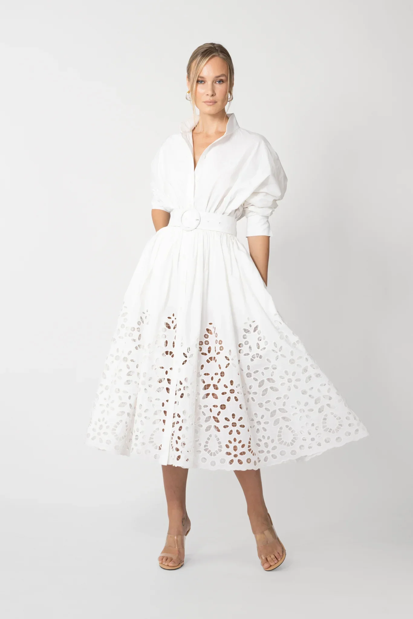 Cotton poplin midi shirtdress with classic mandarin collar, embroidered eyelet detail, and scalloped hem