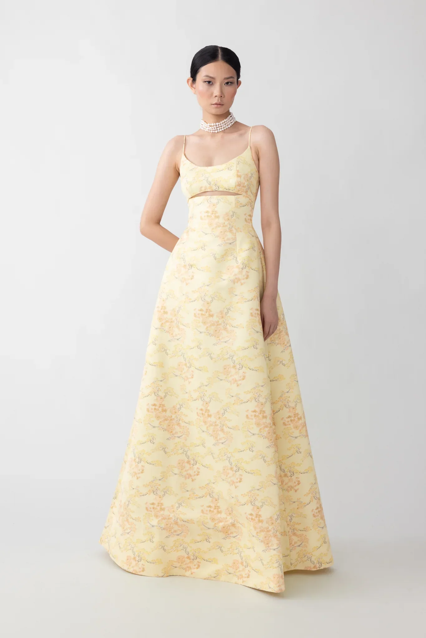 Printed satin gown with thin shoulder straps, a small peak-a-boo cut-out and A line skirt