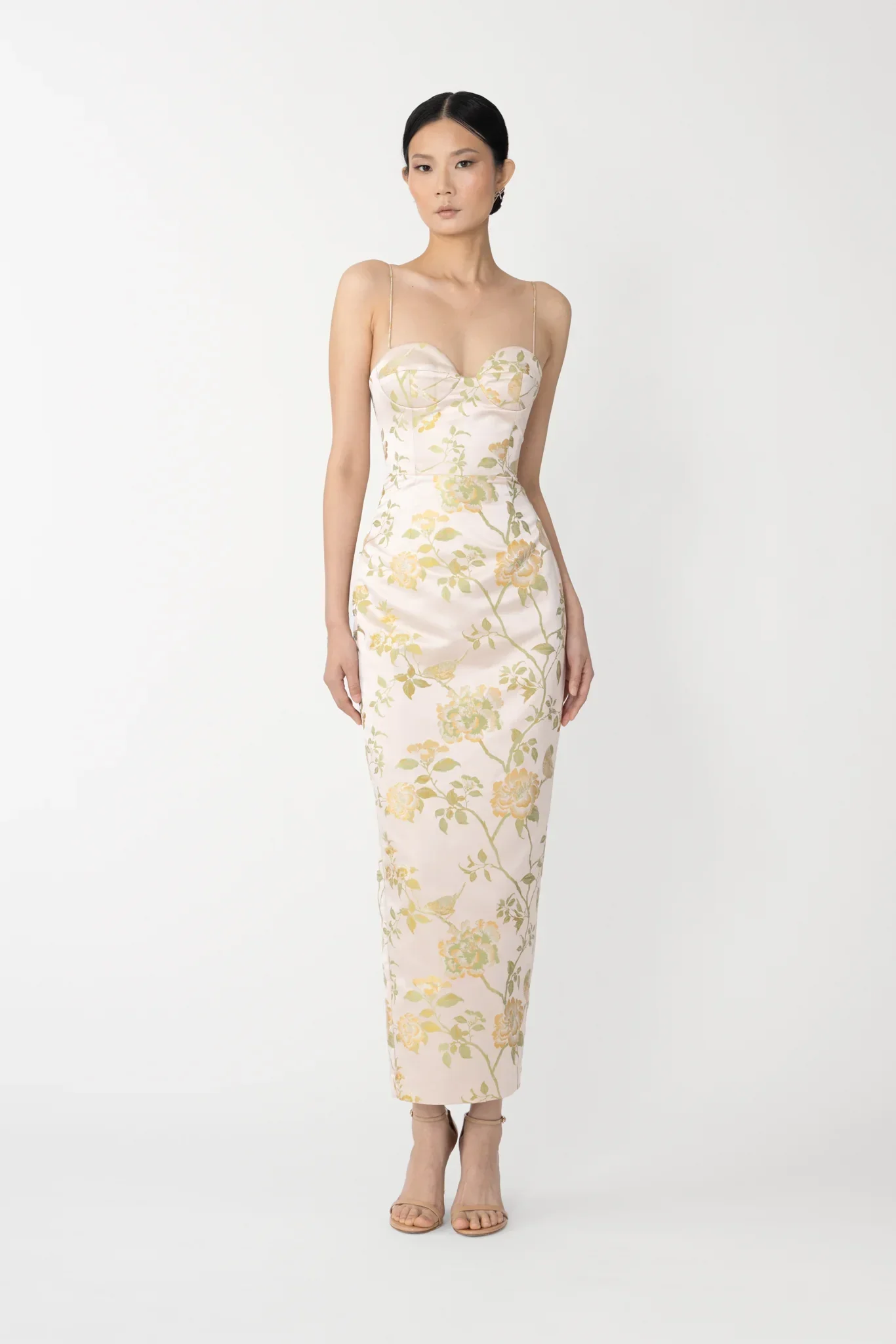 Brocade strap midi dress with bust cups and pencil skirt