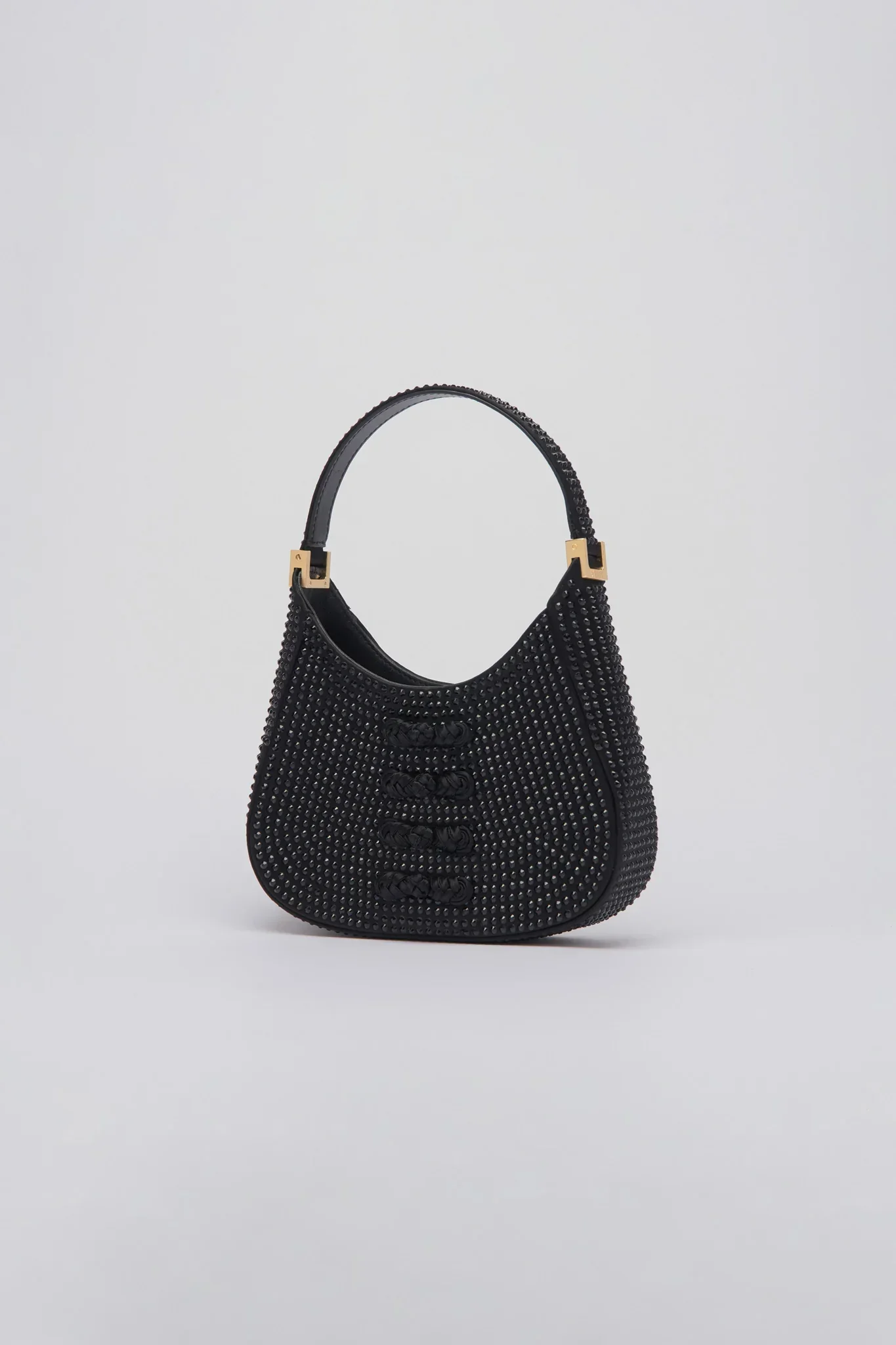 Our pipa-shaped mini bag crafted from deluxe satin with a leather base and handle. Adorned with premium tone-on-tone color crystals and our signature hand-tied pipa knot buttons. Adding that extra bit of sparkle to complete the look. The mini sau is the perfect size to carry what you need while looking chic on any occasion.