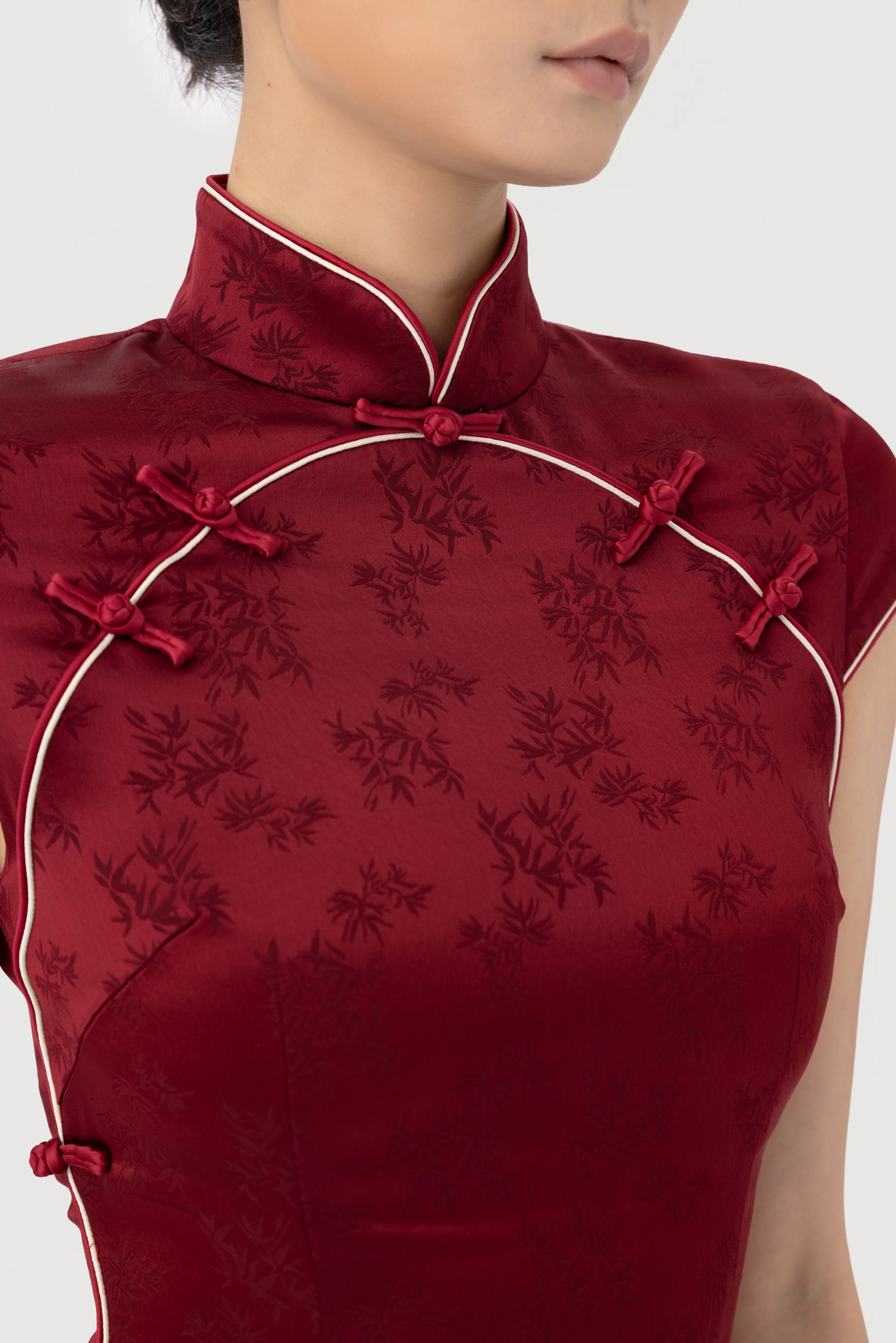 Crafted from luxurious satin jacquard, featuring cap sleeves and a mini silhouette design. Delicate double satin piping and hand-tied knot buttons add refined detail, while a side slit introduces a contemporary finish. The Ren dress is a flirty rendition of the classic cheongsam.