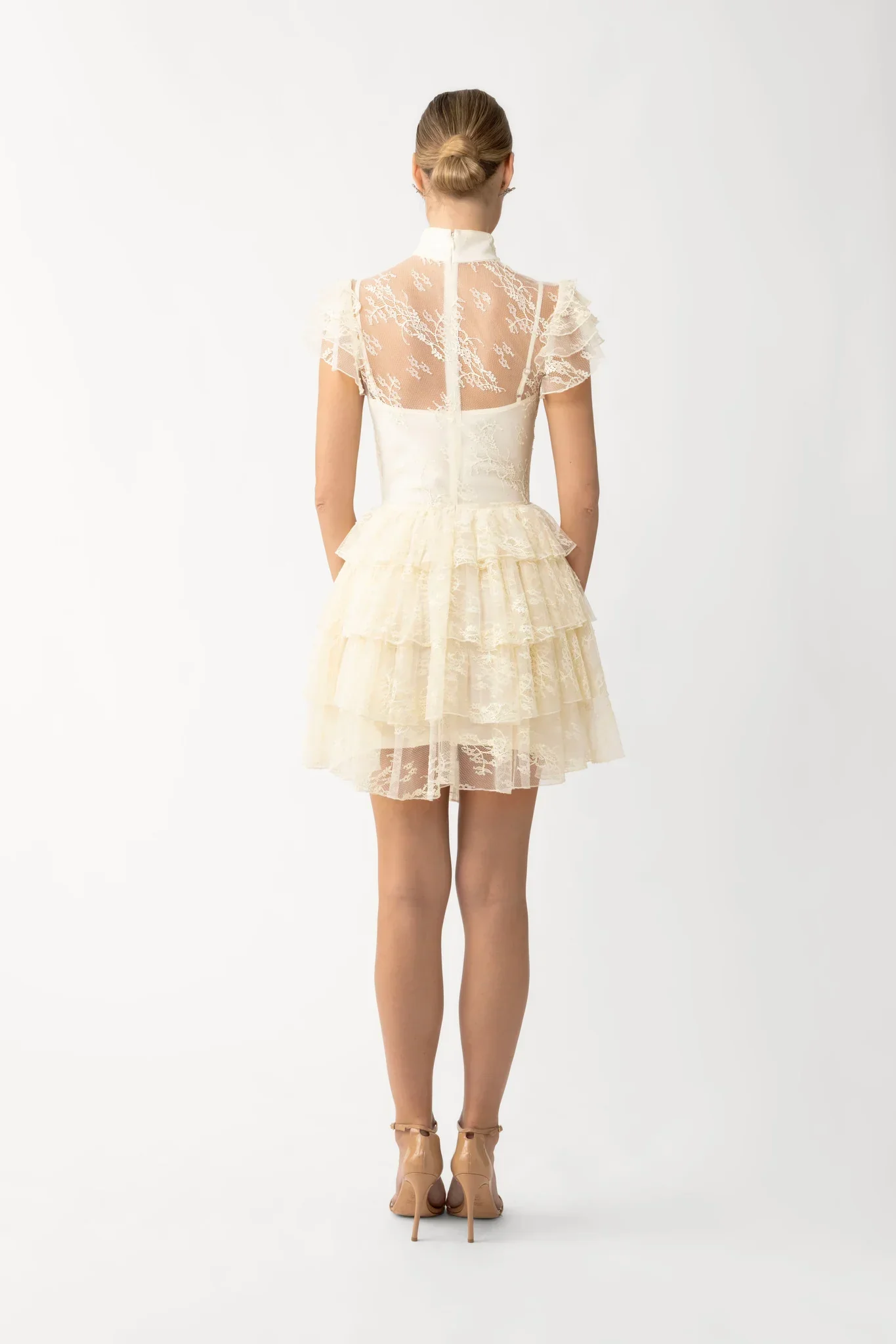 The Roux Dress is cut from intricate lace, featuring a signature mandarin collar and hand-tied pipa knots. Softly ruffled sleeves and a mini skirt add a romantic touch. Comes with a separable slip.