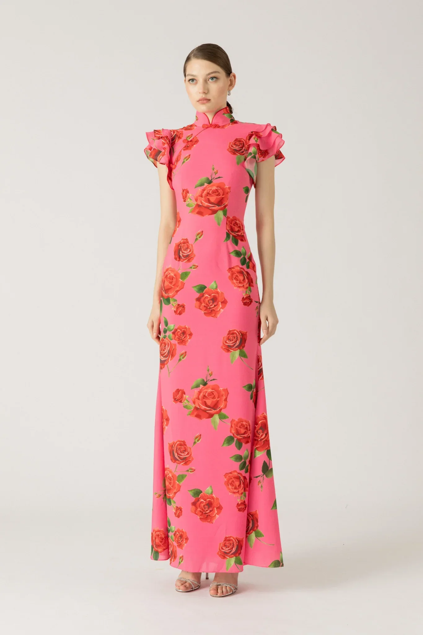 Sylvie is a statement maxi in a SAU LEE original rose print on stretch fabric. Featuring our signature Mandarin collar with contrast piping and decorative frog buttons at the shoulder, layered ruffle sleeves, and a full-length trumpet skirt.